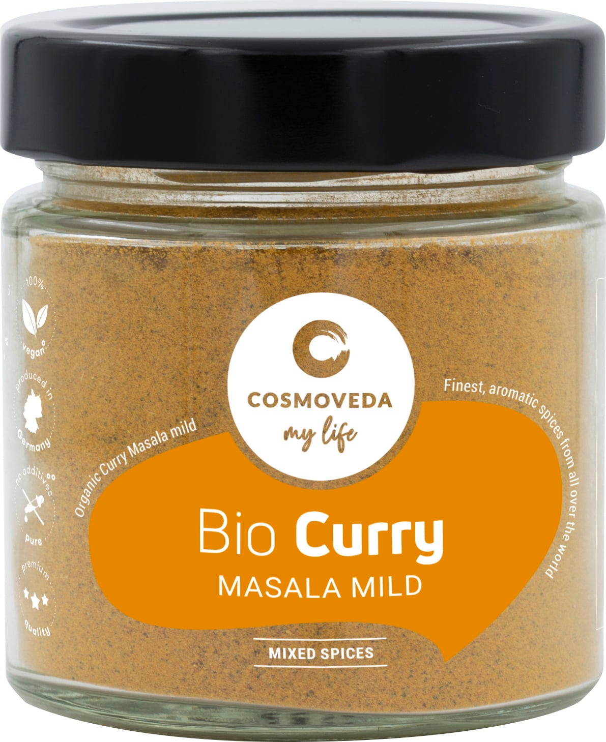 Das Cosmoveda Curry Masala mild ist eine Mischung aus 9 wertvollen Gewürzen und wird vielseitig in der Indischen und Ayurvedischen Küche verwendet.