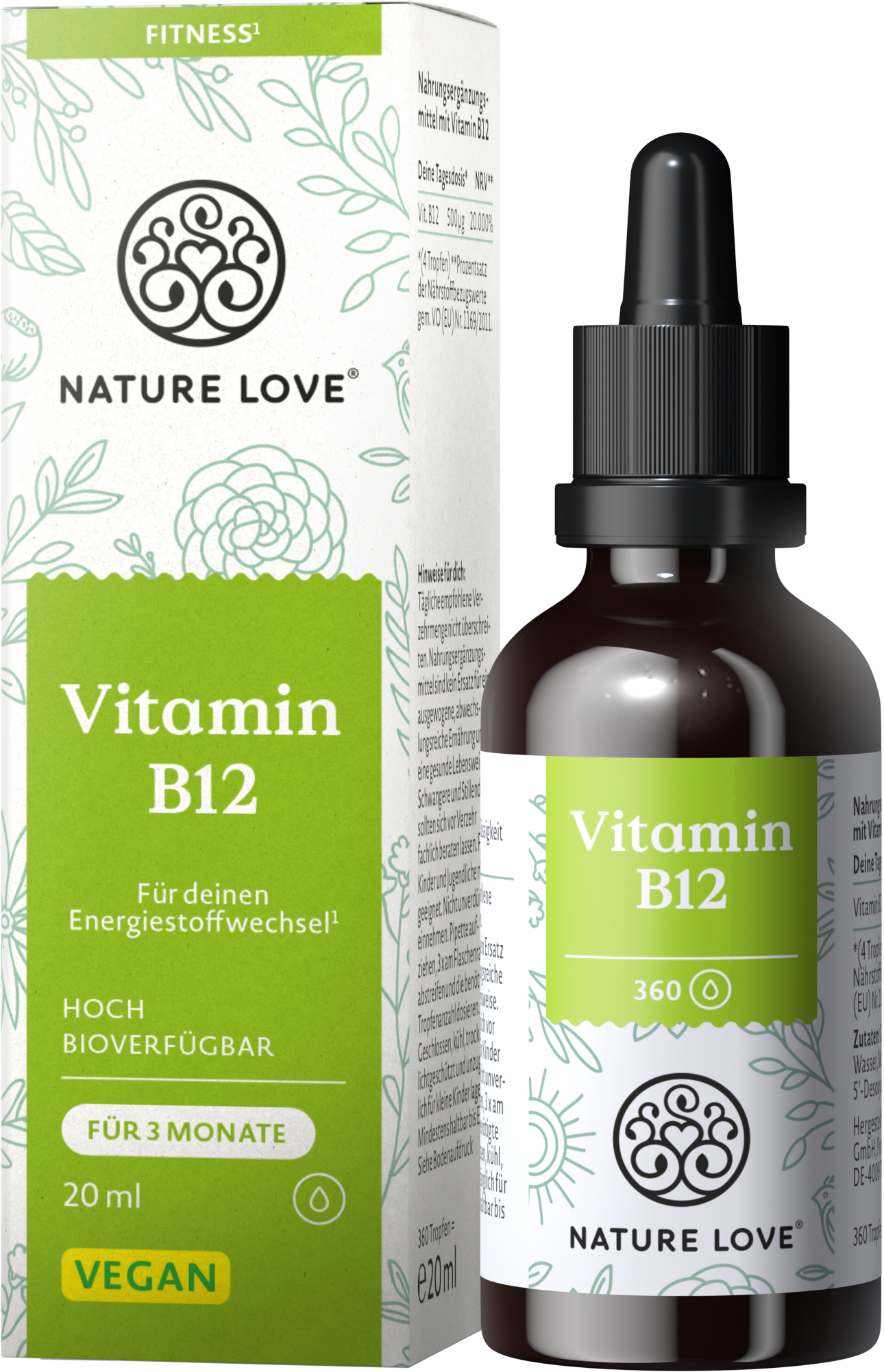 Diese Tropfen von Nature Love enthalten hochwertiges Vitamin B12 in den beiden bioaktiven Formen Methyl- und Adenosylcobalamin. Vitamin B12 ist für sehr viele Prozesse im Körper mitverantwortlich. In seiner natürlichen Form hat Vitamin B12 eine rote Farbe, deshalb haben auch diese Tropfen einen satten Rotton – ohne zugesetzte Farbstoffe. Die Tropfen sind alkoholfrei und zu 100 % vegan.