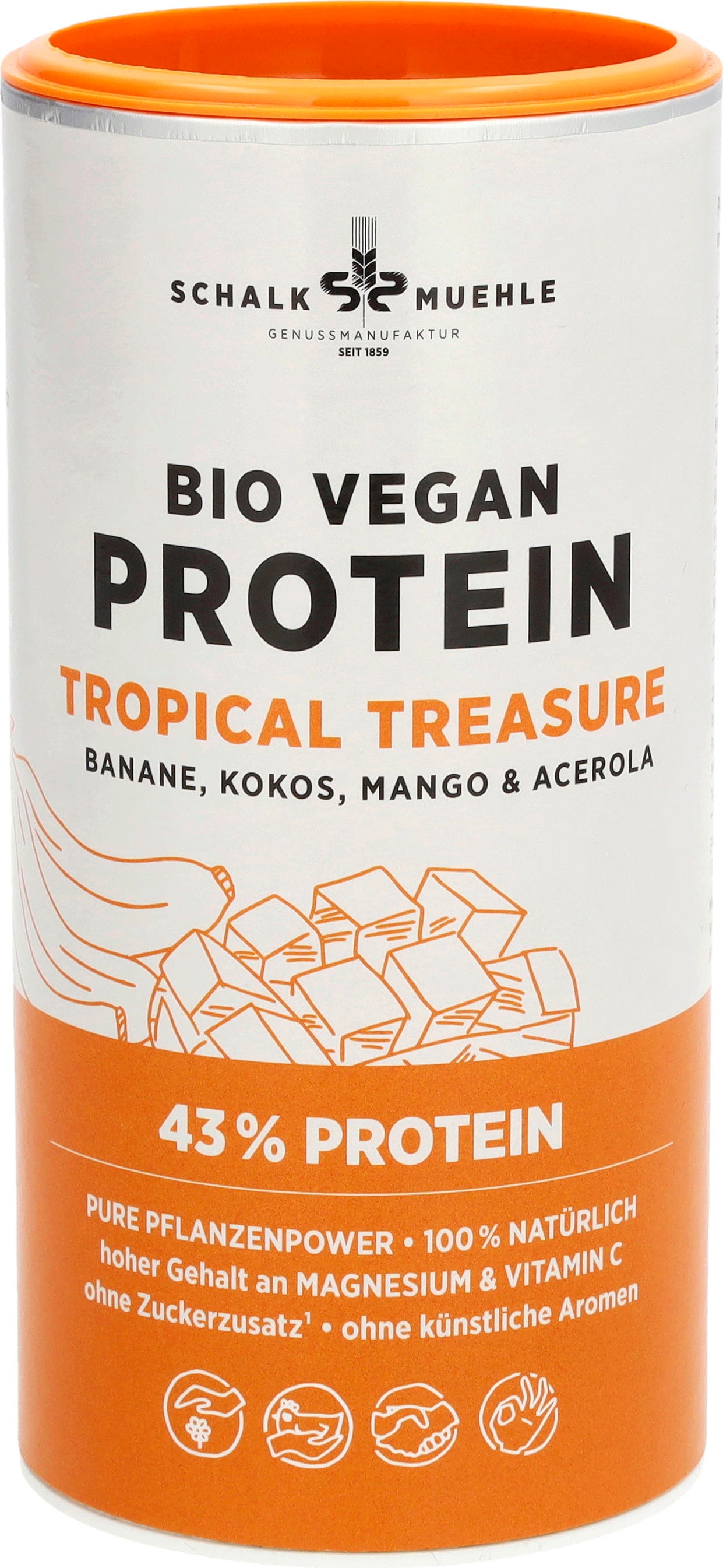 Hier geben Banane, Mango, Kokos und Acerola den Ton an – das vegane Bio Tropical Treasure Proteinpulver von Schalk Mühle überzeugt mit seinem fruchtig-exotischen Geschmack und einem hohen Gehalt an Magnesium und Vitamin C. Ob als Shake, im Müsli, Joghurt oder Smoothie – das Proteinpulver ergänzt deinen Alltag auf vielfältige Weise. Und das Beste: Die Rezeptur ist komplett frei von künstlichen Aromen und Zuckerzusätzen. Somit steht deinem ausgewogenen Ernährungsstil nichts mehr im Weg.